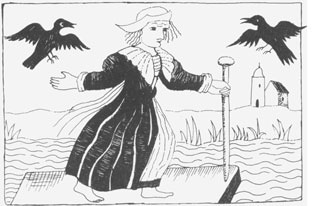 The Witch of St. Pancras: Shown here crossing the Fleet River with Old St. Pancras Church in the background. From a printed printed by John Hammond in 1643 entitled "A Most Certain, Strange and True Discovery of a Witch". In 1968, the Beatles used the Church graveyard for the inside shot of their double album The Beatles: 1962-1966. Thus, the advent of Christianity and Saxon rule probably saw the end of the worship of Herne the Hunter in the area, although the tradition of May Day and the Horn Fair has survived through to the present day. Herne the Hunter in South-East BritainSeveral writers, such as E. O. Gordon, Jack Gale, John Matthews and Chesca Potter, have all highlighted Greenwich's much older history - that of being a site of great significance to our Celtic forebears in pre-christian times. I was always intrigued by it's name the "Green Village", with it's possible connections to earlier May Day festivals, and the Horned God, Herne the Hunter, commonly known in this part of Britain, as The Green Man. Thus, it is clear that the Pagan history of Greenwich and Deptford goes back into the mists of time where all that survives today are folklore, myth and legend. Few would now accept that the old city of London and the Kentish villages (as they were then) of Greenwich and Deptford had no history before the Roman occupation in 43 AD. The Green Man, who in the Celtic myth was known as the King of the Underworld, was known by many names in Celtic Britain: as Arawn as he rides over Pembrokeshire; as Gwyn ap Nudd as he hunts between Glamorganshire and the West country; while further east, he appears as Herne the Hunter. He is always accompanied by his white hounds, which have the tell-tale red-tipped ears of dogs of the underworld, according to Caitlín Matthews, writing in Mabon and the Mysteries of Britain (Arkana, London, 1987, p23). I believe that that worship of Herne was a strong religious practice among the early Celts of this area of South East London in pre-christian times (England was declared a Christian country under the Saxon Kings in 665AD). St. Paul's Cathedral in London was a site originally dedicated to the worship of the Stag Goddess, Diana. According to the Annals of St. Paul's (1879), St. Paul's Cathedral was a site of a temple - probably a stone circle - until the Aethelberht had it destroyed and the site rededicated as a Christian site between 604AD and 610AD, as noted in 1879 by John Murray in the Annals of St. Paul's (Quoted in Hell, Volume Two, May 1994. Alan Moore and Eddie Campbell, Kitchen Sink Press/Mad Love Publishing, MA, USA, 1994. However, it takes a long time for people to forget or lose religious practices which are thousands of years old. The investigative writers Alan Moore and Eddie Campbell state: "The continuation of clearly Diana centred rituals at St. Paul's until almost a thousand years after the alleged ascendancy of Christianity is documented in John Stone's Survey of London (1598), in which he tells how a buck and a doe (Diana's sacred animals), would be slaughtered at the high altar upon a certain date each year, after which the head would be paraded about the cathedral upon a pole while horns were blown to announce the sacrifice, these being answered by horn blasts from every quarter of London. Commentators at the time remarked: 'It seems we have our Diana worship back' ". In Windsor Park, people still claim to have seen Herne the Hunter or heard his dogs calling out through the mist. These ghostly appearances are said to be seen when Britain is under threat, for example, just before the Second World War. According to Eric L Fitch, writing In Search of Herne the Hunter (Capell Bann, Berkshire, England, 1994, p161), the last time it was reported seen was by a soldier guarding Windsor Castle in 1976. Matthews and Potter also claim that the Isle of Dogs - which was a combination of forest and marshland until quite recently - is haunted by a ghostly huntsman riding through the sky with a pack of phantom hounds. In their view, it is probable that Herne the Hunter was once worshiped on the island, and his "presence" still lingers there. A carving of a head that resembles the Green Man can be found above an old entrance to a house bordering Greenwich Park in Park Vista: It shows his head with the leaves and bushes growing out of his mouth, nostrils and ears - a common representation of the Green Man (see picture).